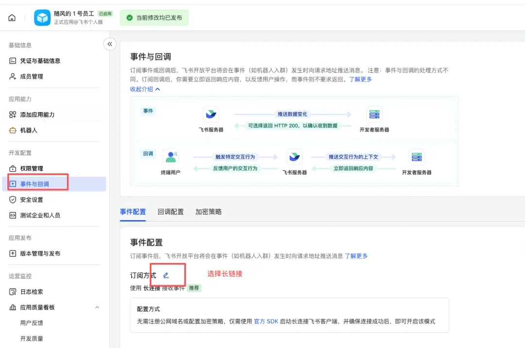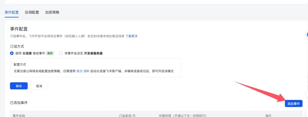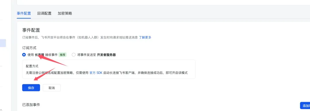 5. 配置事件:选择长连接