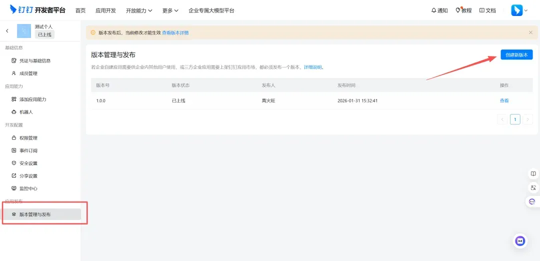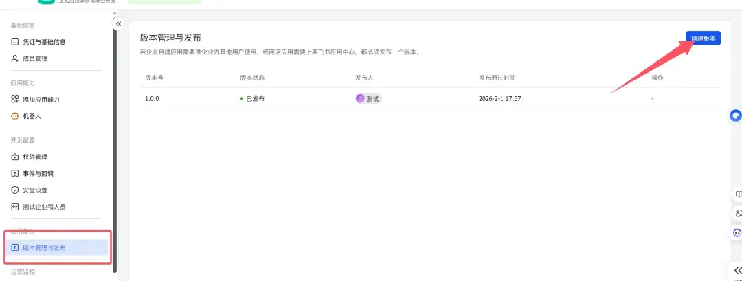 7. 完成后点击版本管理与发布,进行创建版本