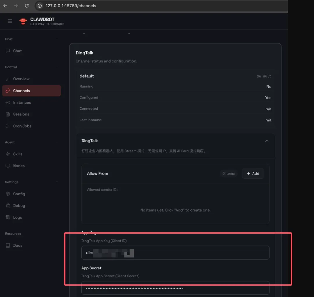 3. 复制应用凭证粘贴到 openclaw-channels 栏中点击保存