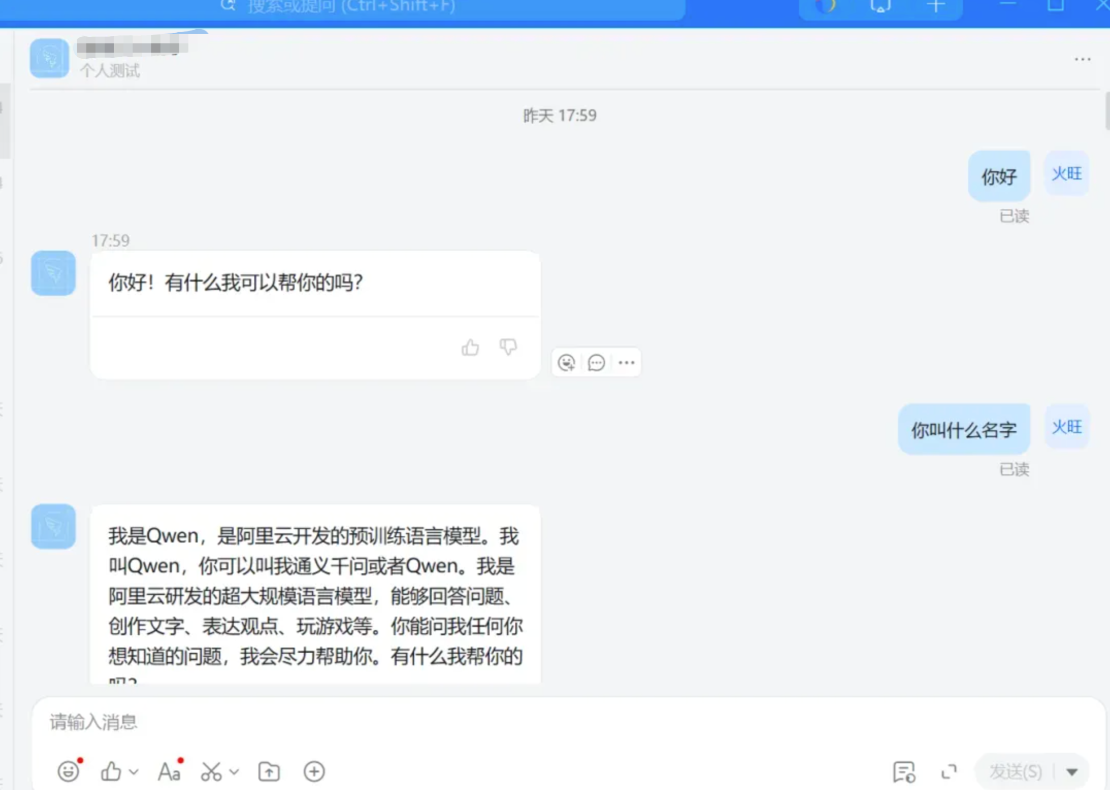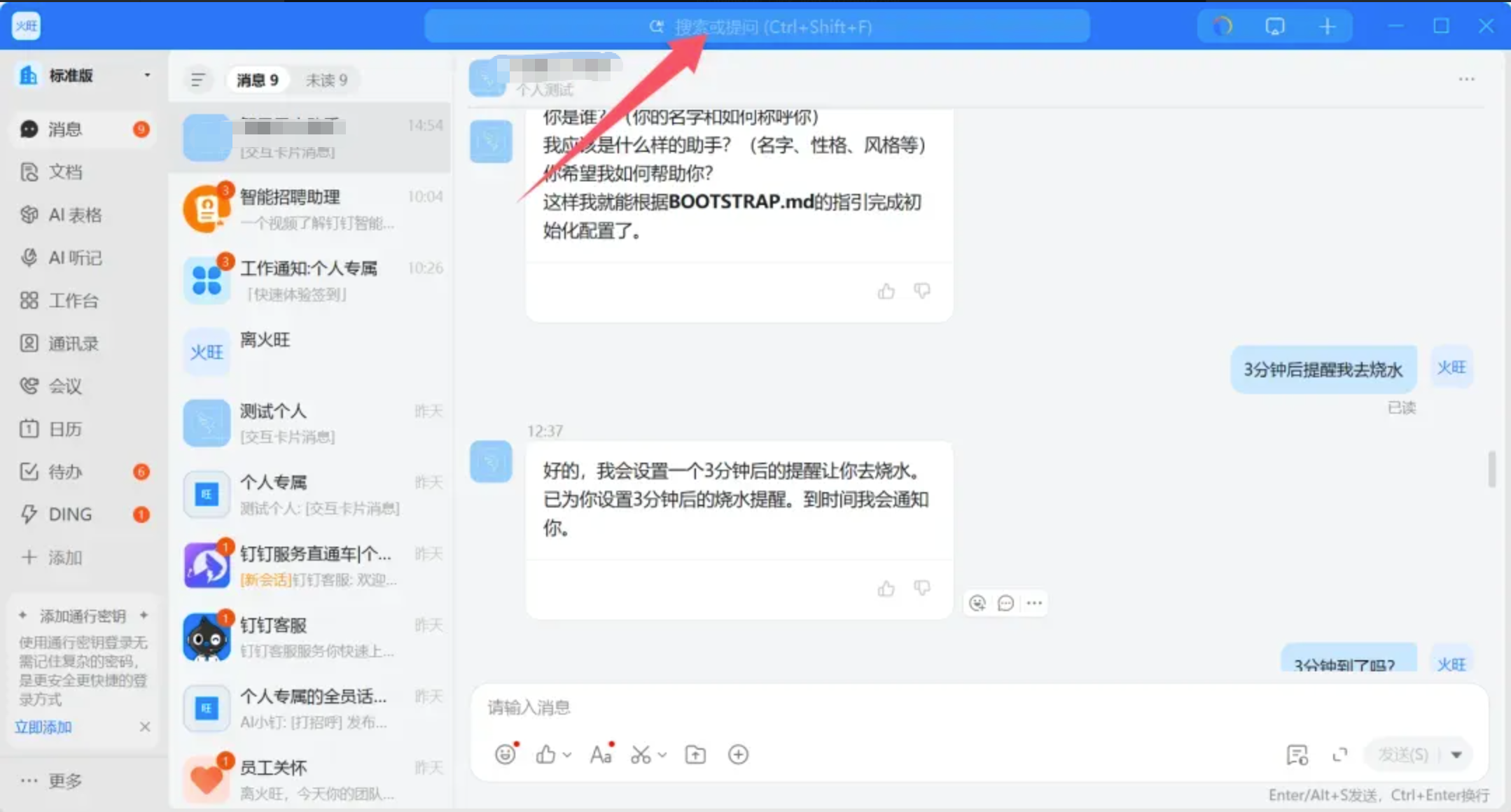 打开飞书,搜索机器人名,进行问答交互