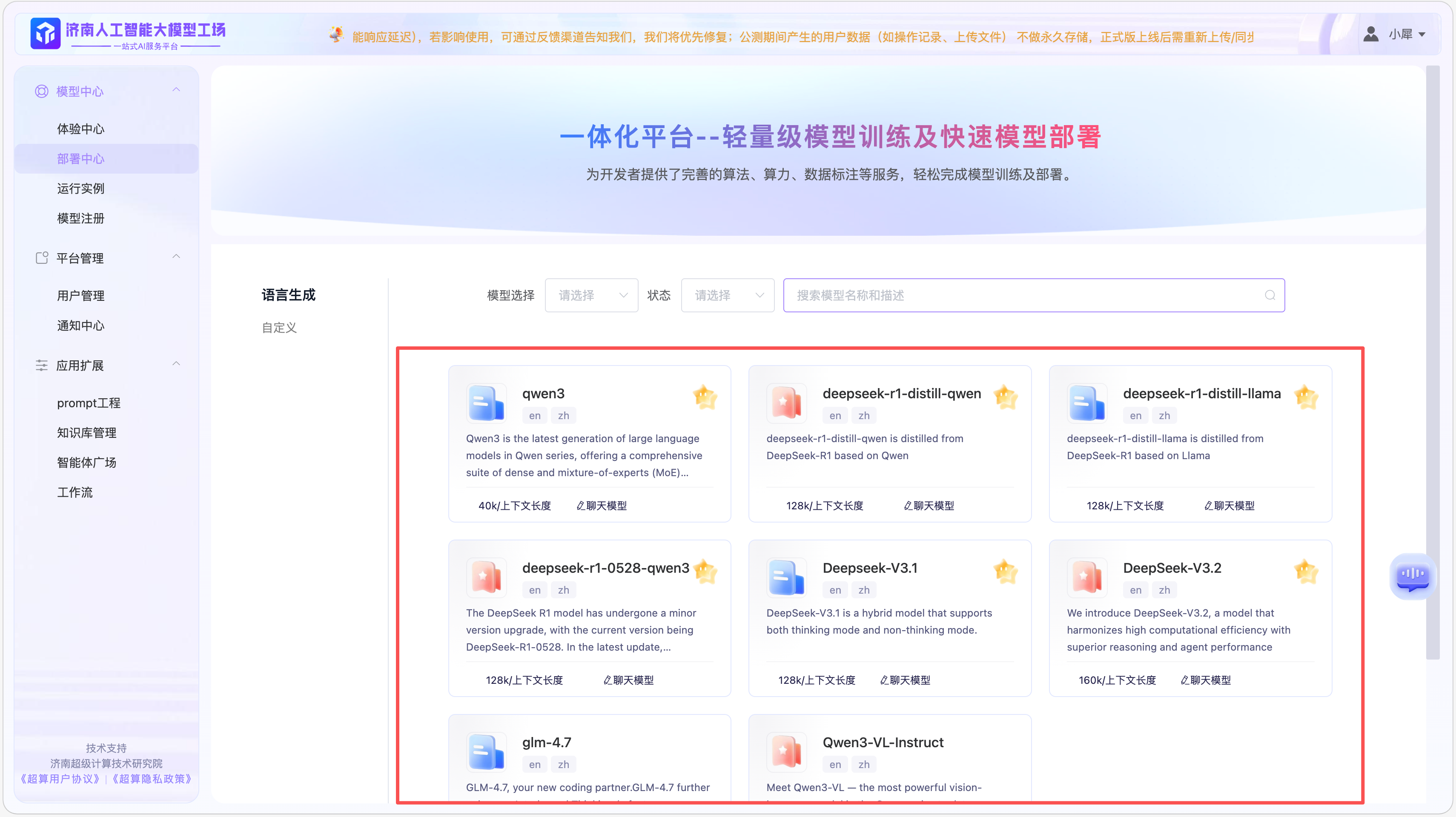 济南人工智能大模型工场是一站式 AI 服务平台,提供大模型部署、调用与管理能力。当前已接入多款主流大模型与向量嵌入模型,支持通过标准 OpenAI 兼容接口进行调用。