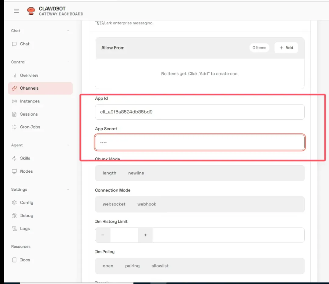 3. 复制应用凭证粘贴到 openclaw-channels 栏中点击保存