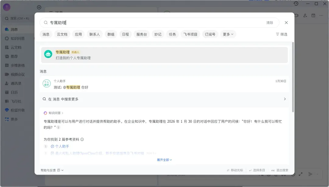 打开飞书,搜索机器人名,进行问答交互