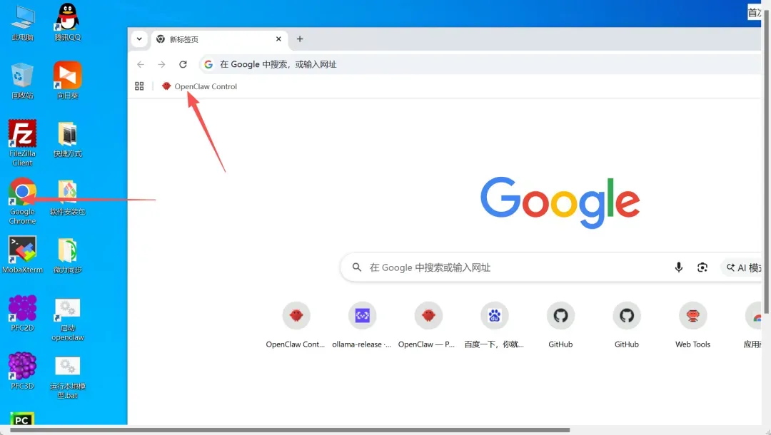 3. 打开浏览器,点击书签中的 OpenClaw 图标。