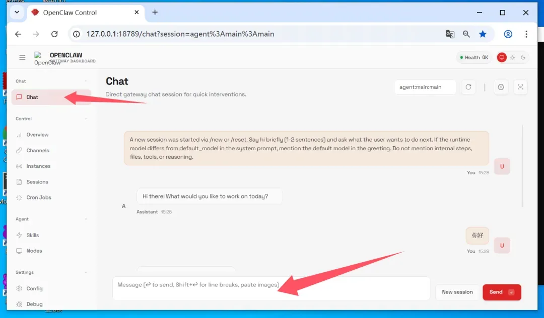 进入到 OpenClaw 界面的 chat 页面,进行对话,第一次对话比较慢,回复则说明启动成功